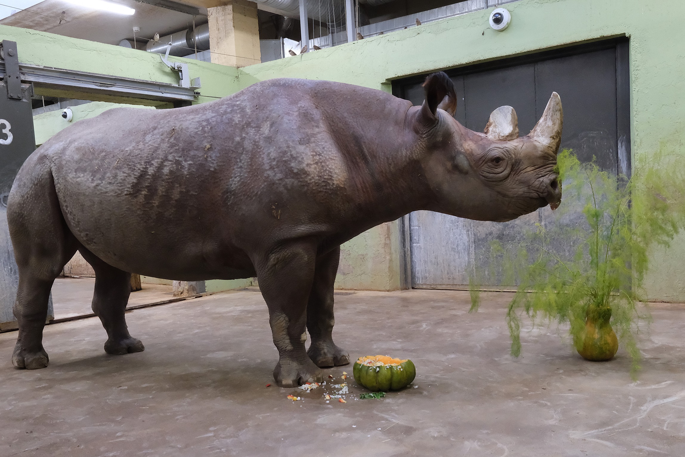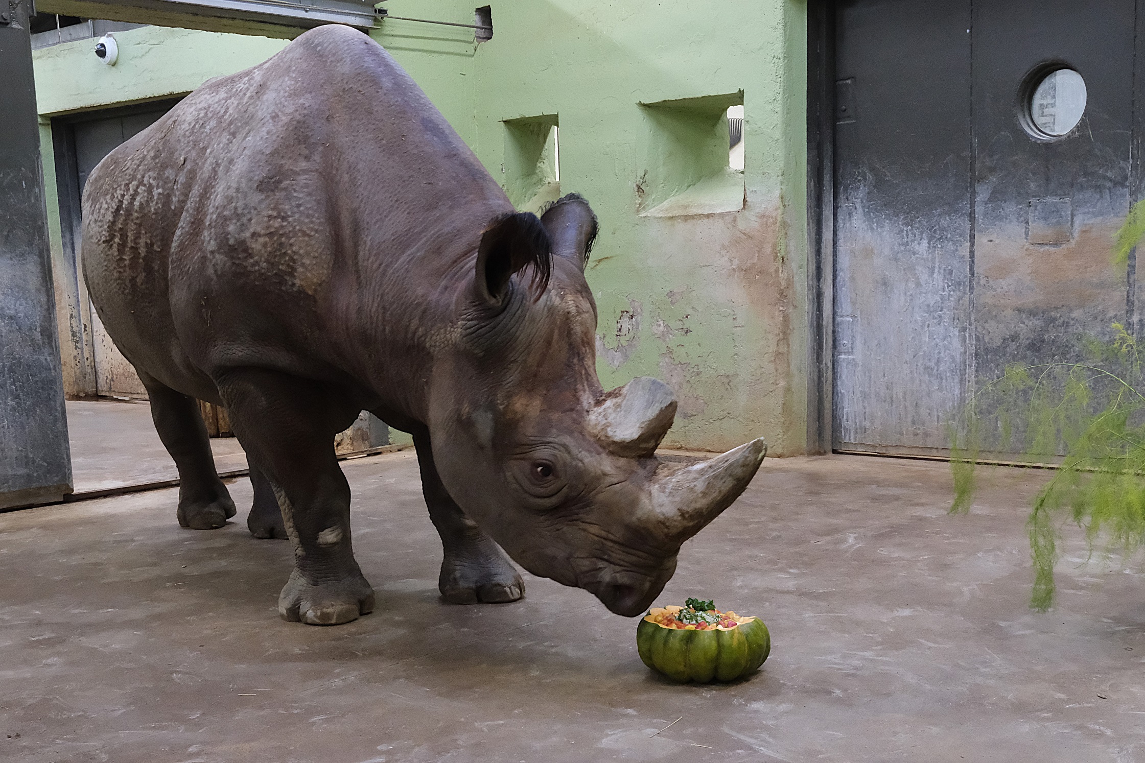 Pühapäeval saab 22-aastaseks meie teravmokk-ninasarvik Binti. Sünnipäeva eel pakuti talle kõrvitsakausis pehmele seemnetega kõrvitsasisule lisaks keedetud riisi, hakitud murulauku ja õunatükke, peal kaunistuseks salatileheke. Ka suur punt asparaagust läks mõnusa krõmpsutamise saatel kahesarvelise hiiglase kõhtu.