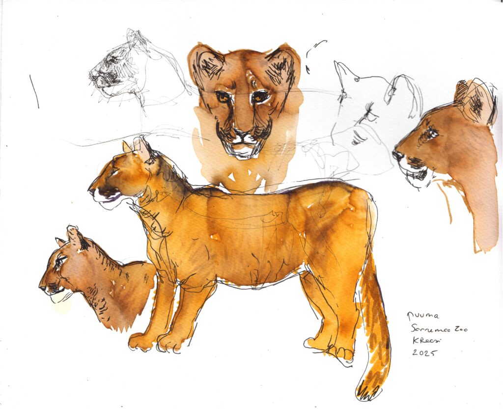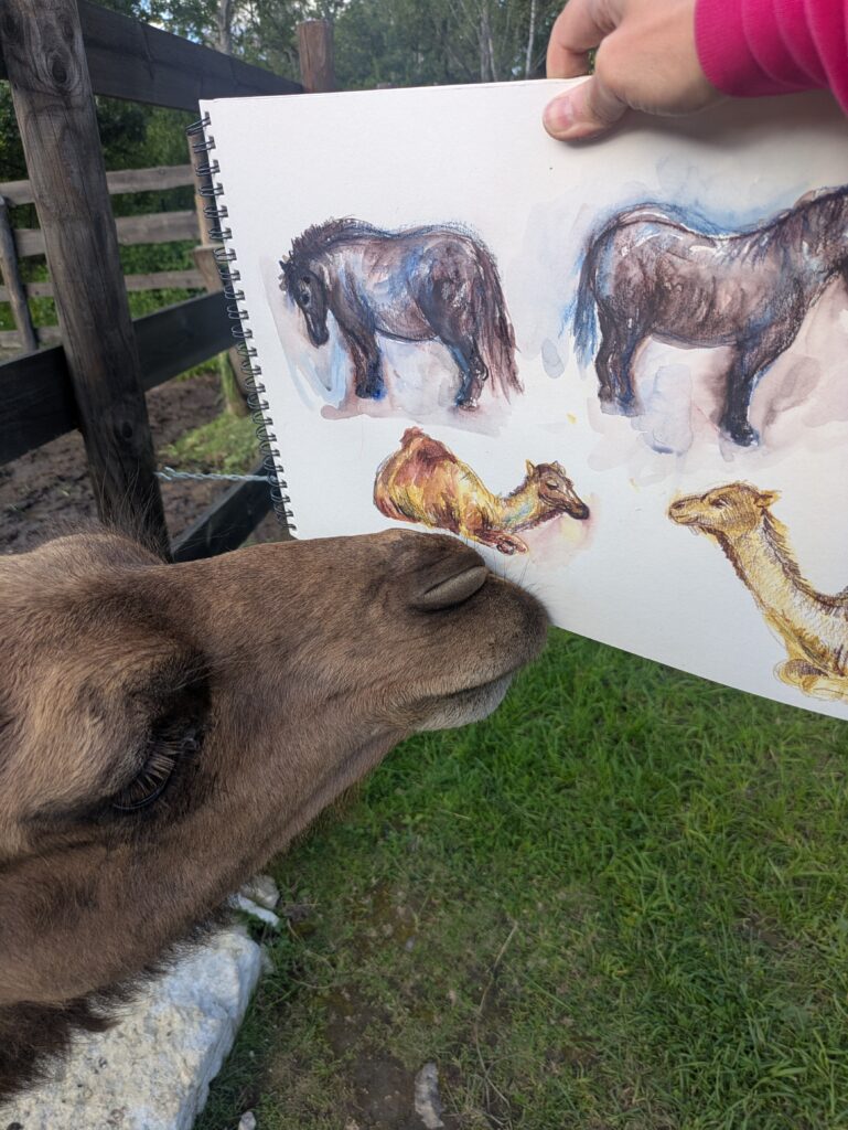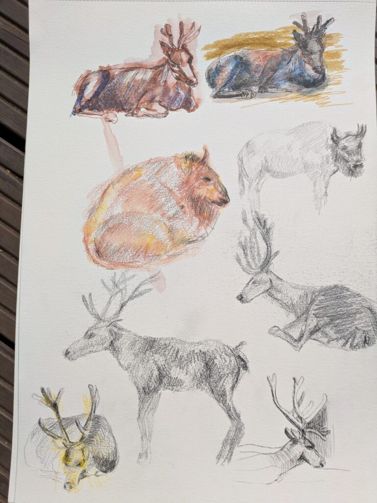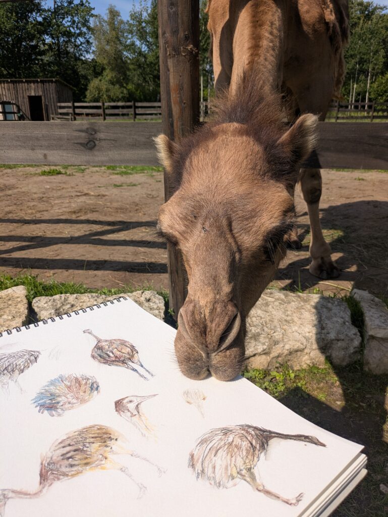 The exhibition includes graphite, pencil and pastel drawings as well as watercolour paintings completed over the past year and a half, starting from August 2024. You may recognise inhabitants of Tallinn, Saaremaa, Helsinki and Riga zoos in the pieces. The viewers might probably recognize at first birds and animals with distinctive shapes represented, as well as larger and calmer species that are easier to distinguish and allow themselves to be observed for longer, such as the giraffe, camel, elephant, rhinoceros and bison, alongside species that the artists have had the opportunity to study closely: the king python, the Central Asian tortoise and several dog breeds.