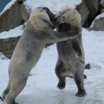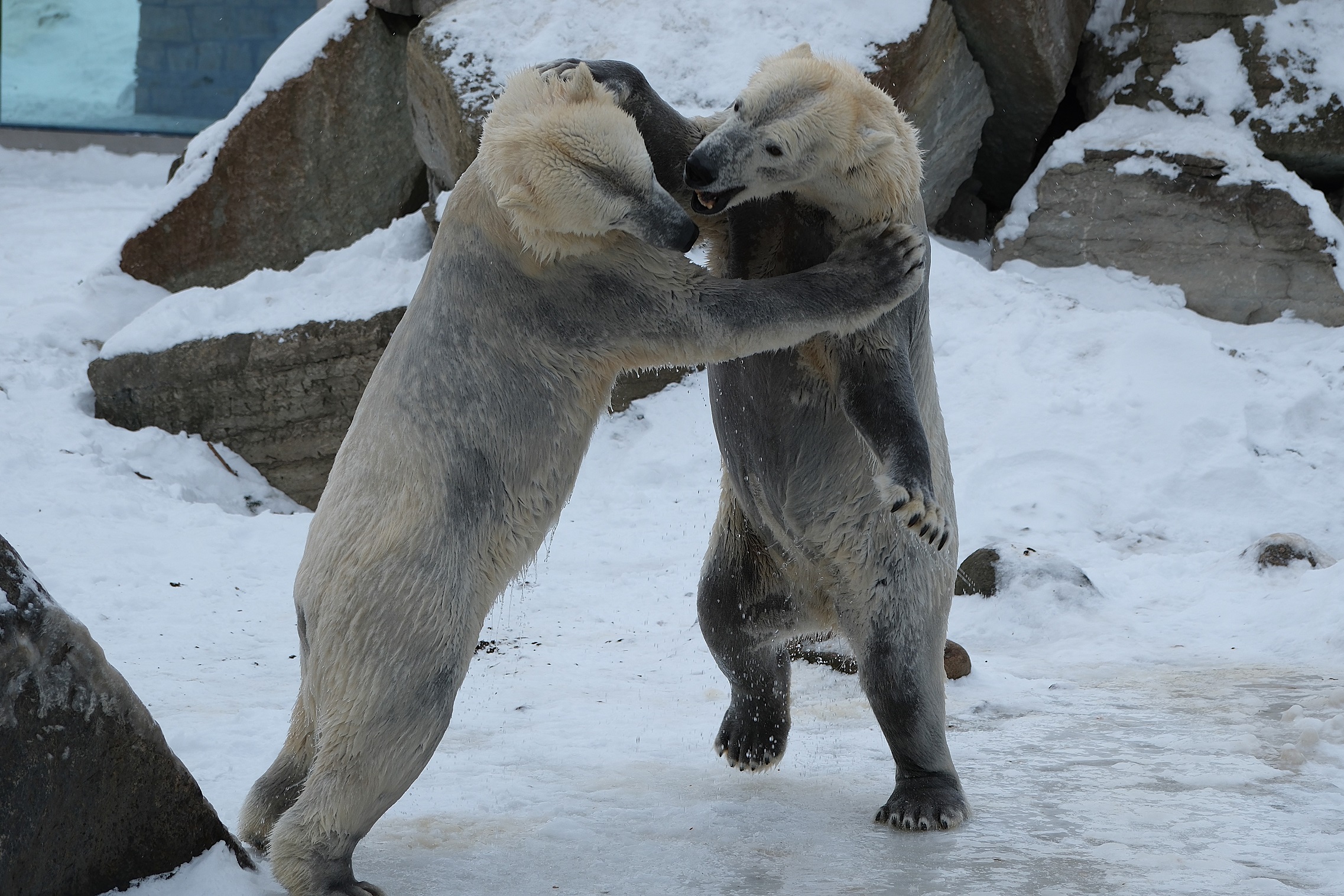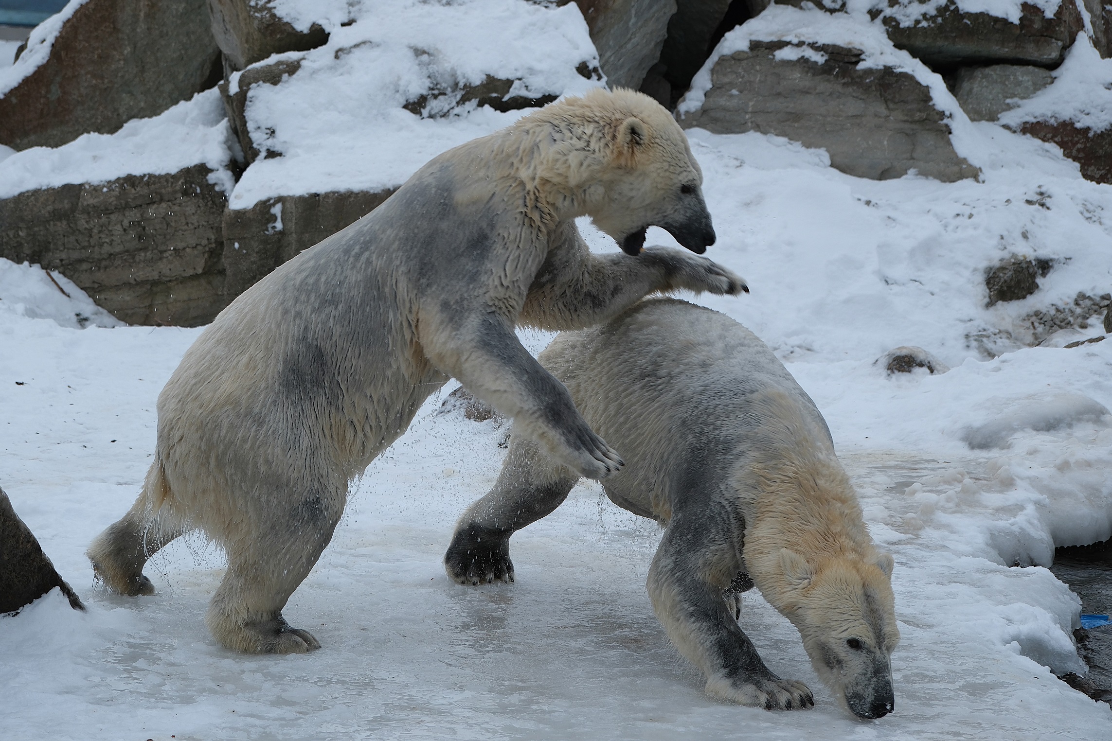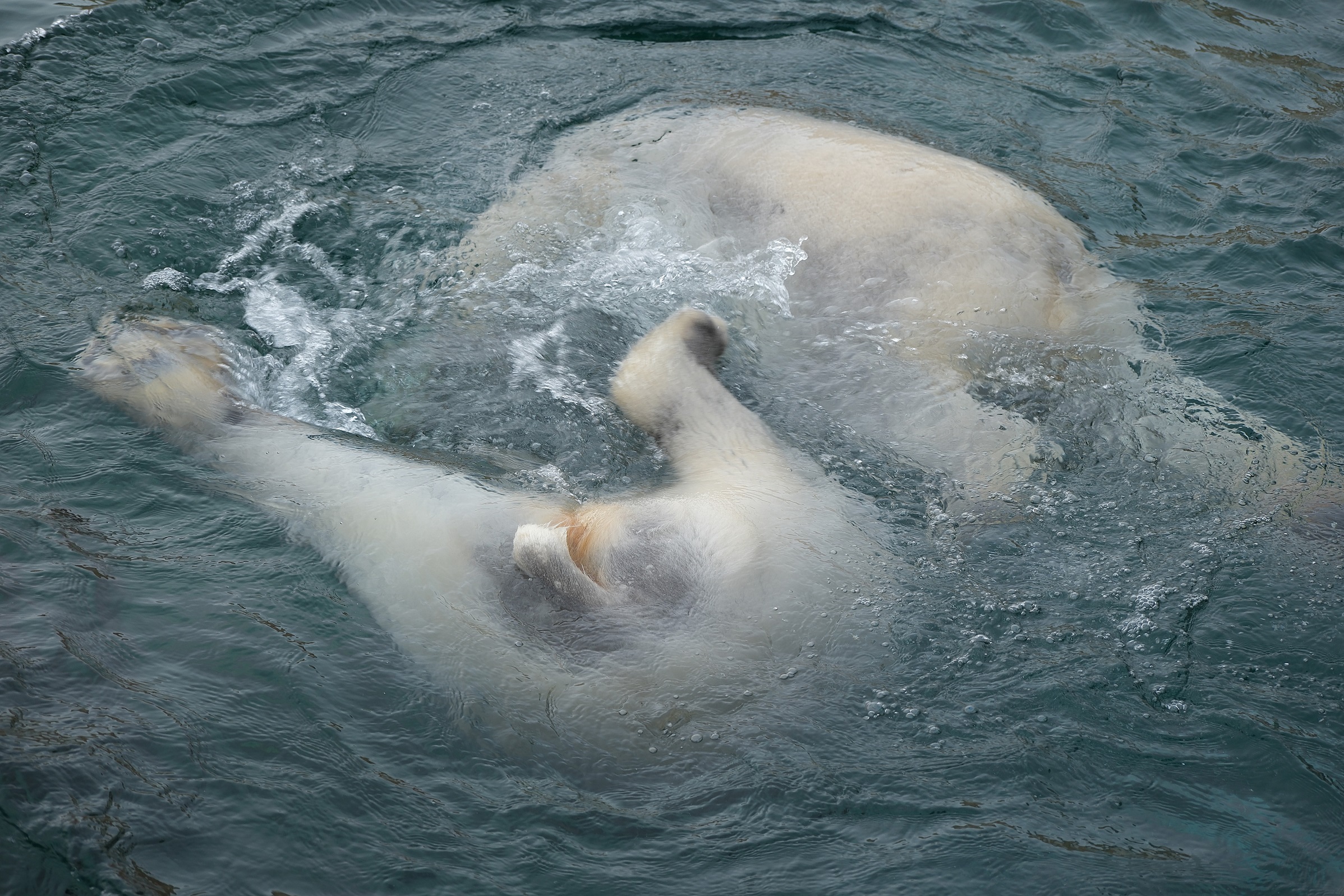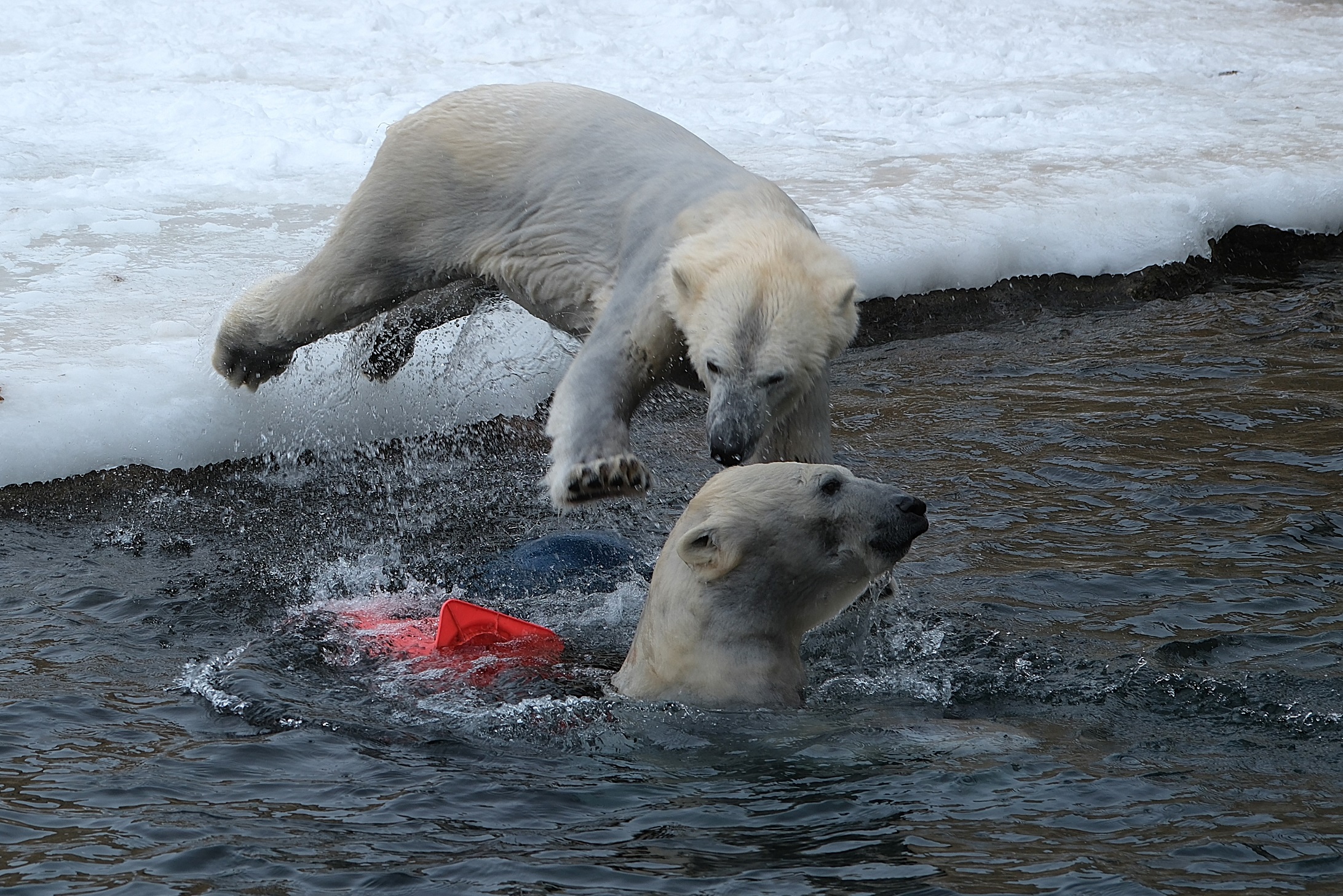 Teisipäeva pärastlõunal, kui luigeparv halli taeva taustal kluugutades üle polaariumi lendas, korraldasid jääkarud Imaq ja Inuk uhke etenduse, möllates nii vees kui ka maismaal.