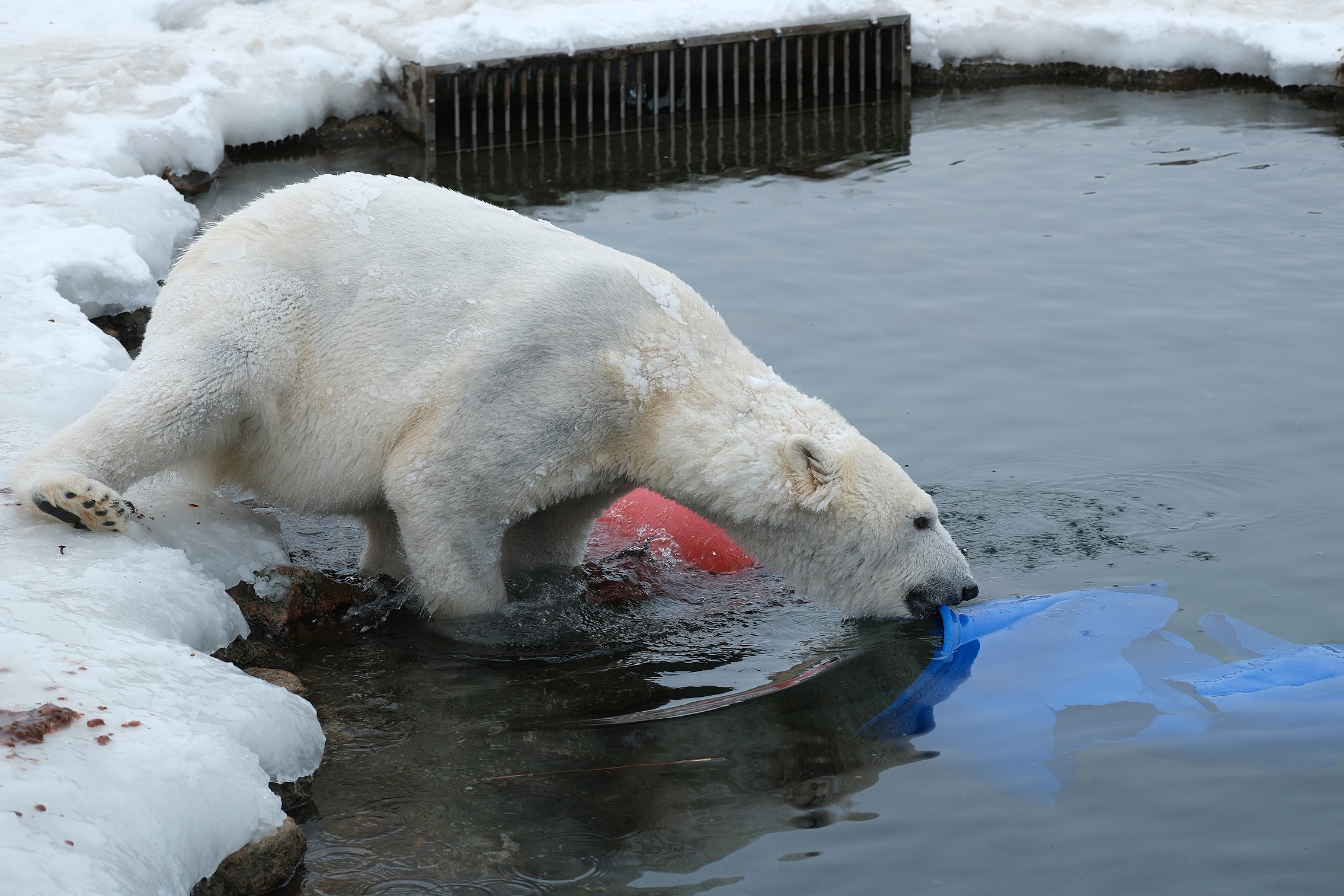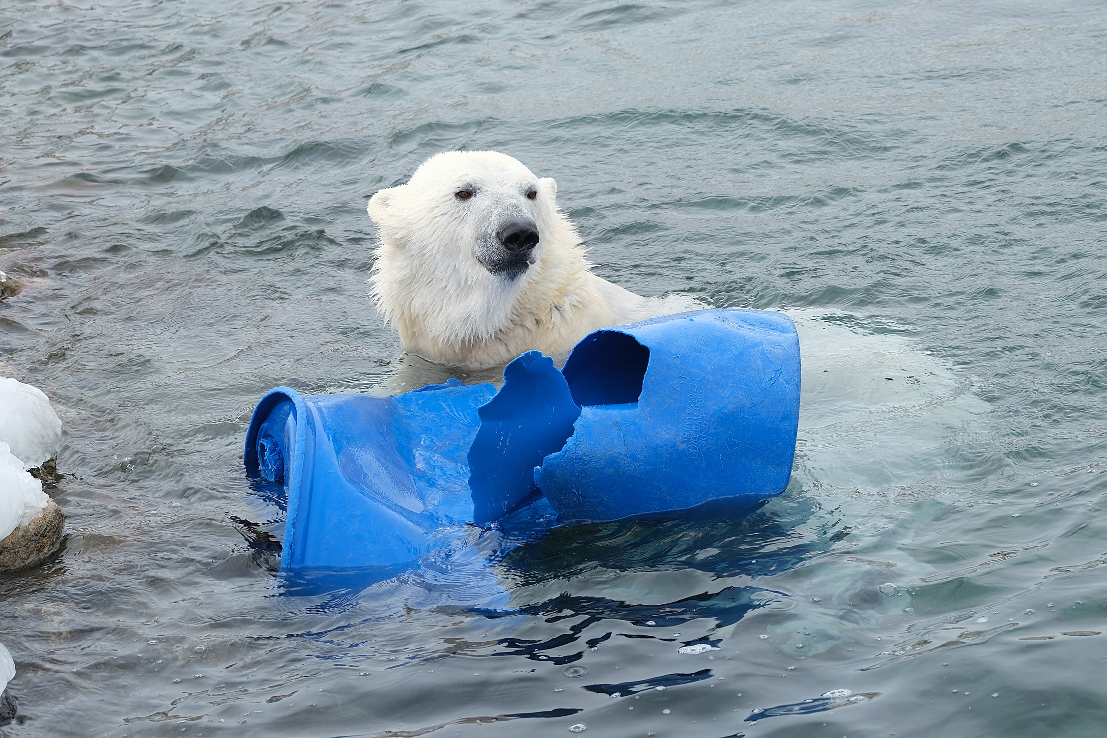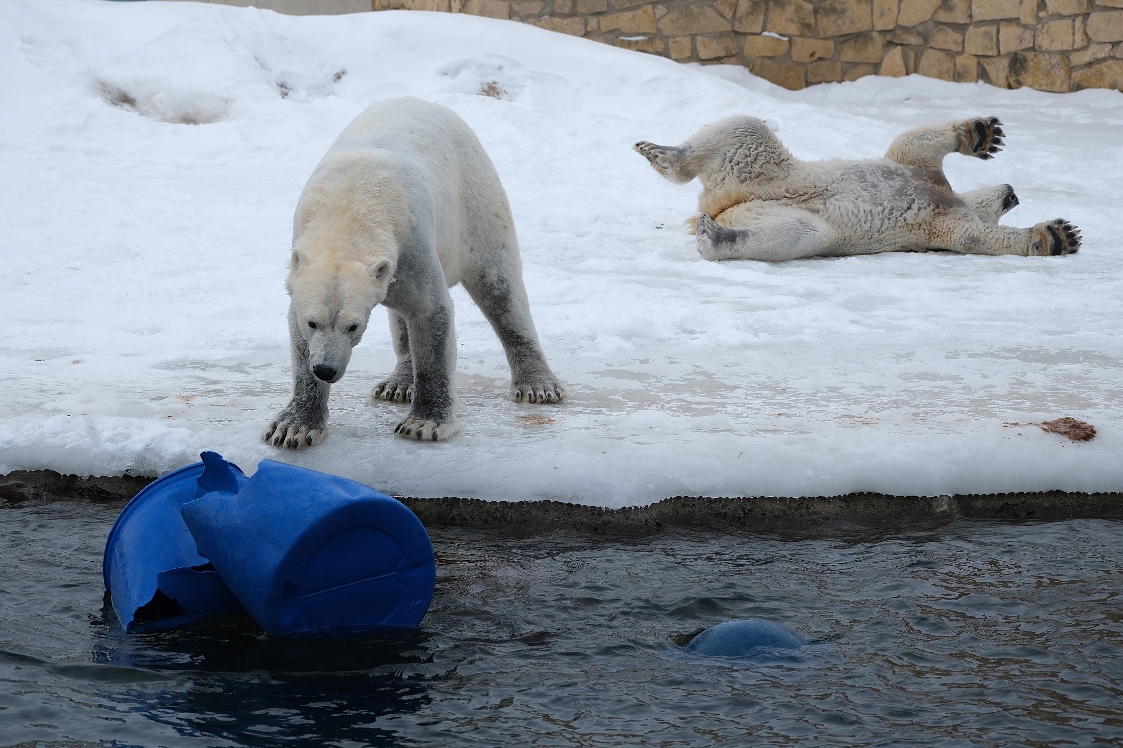 Esmalt tammusid jääkaruõekesed teineteise kannul mööda jäist kaldapealset, kogudes tasapisi kuraasi. Siis õngitses Imaq palgi tagant välja lõhkise sinise tünni, taris vee äärde ja viskas selle hooga vette. Tündrile külma vette järele minna ta esialgu ei tahtnud, vaid püüdis käpaga vett liigutada, et tünn lähemale ujuks. Siis aga läks vette, vedis tünnijäänused kaldale ja asus ruttu karva lumel kuivaks püherdama. Samal ajal kasutas Inuk juhust ning lükkas tünni taas vette. Ja nii päris mitu korda järjest: Imaq toob tünni kaldale, Inuk libistab selle tagasi vette. Lõpuks plärtsasid mõlemad basseinivette ning pealtvaatajate rõõmsate kilgete saatel jätkus möll nii vee all kui ka kaldapealsel.