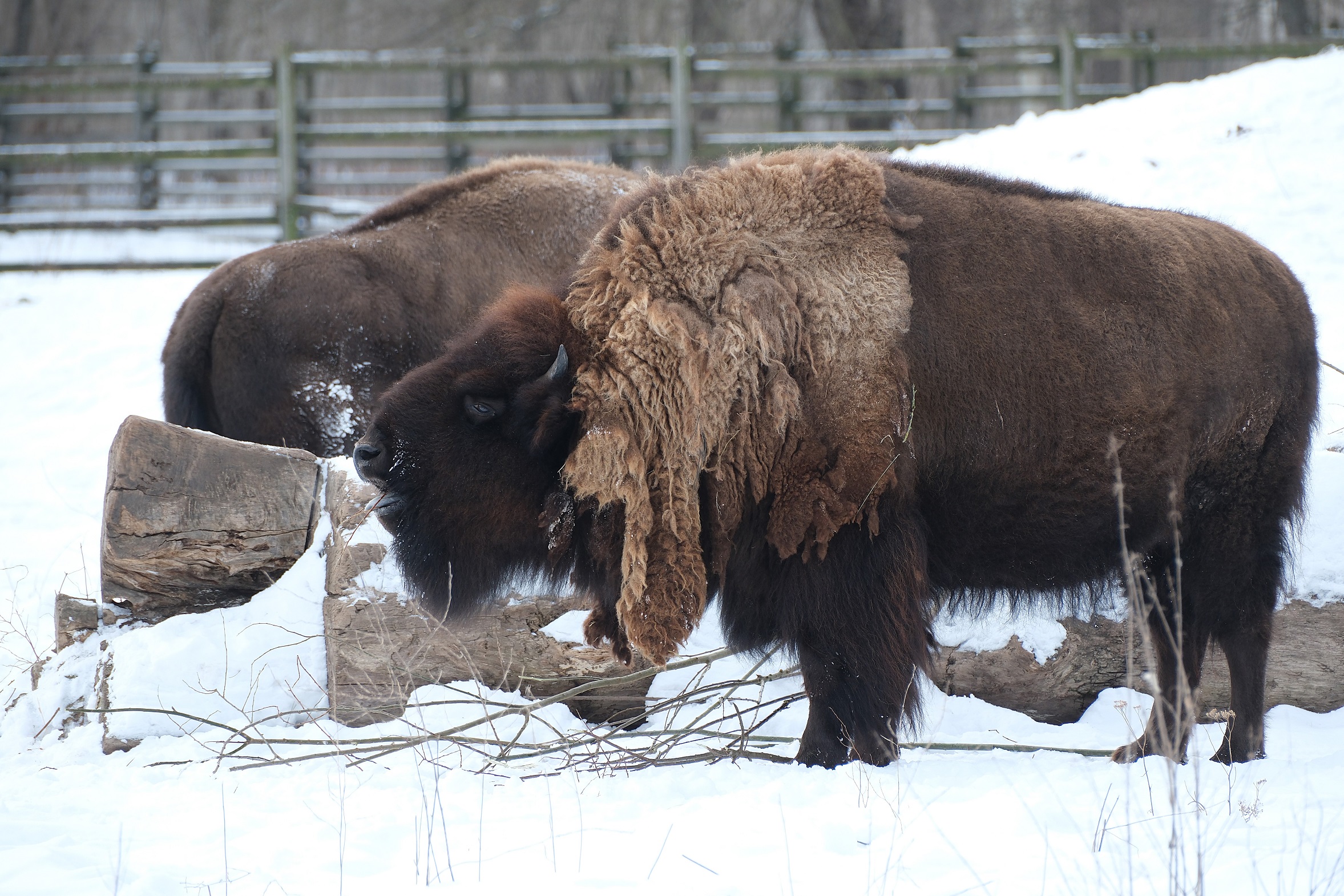 Ameerika piisonilehm, eelmise aasta vanunud karv nagu villatekk õlul, seisab stoilise rahuga lumes ja nilpsab pajuoksi.