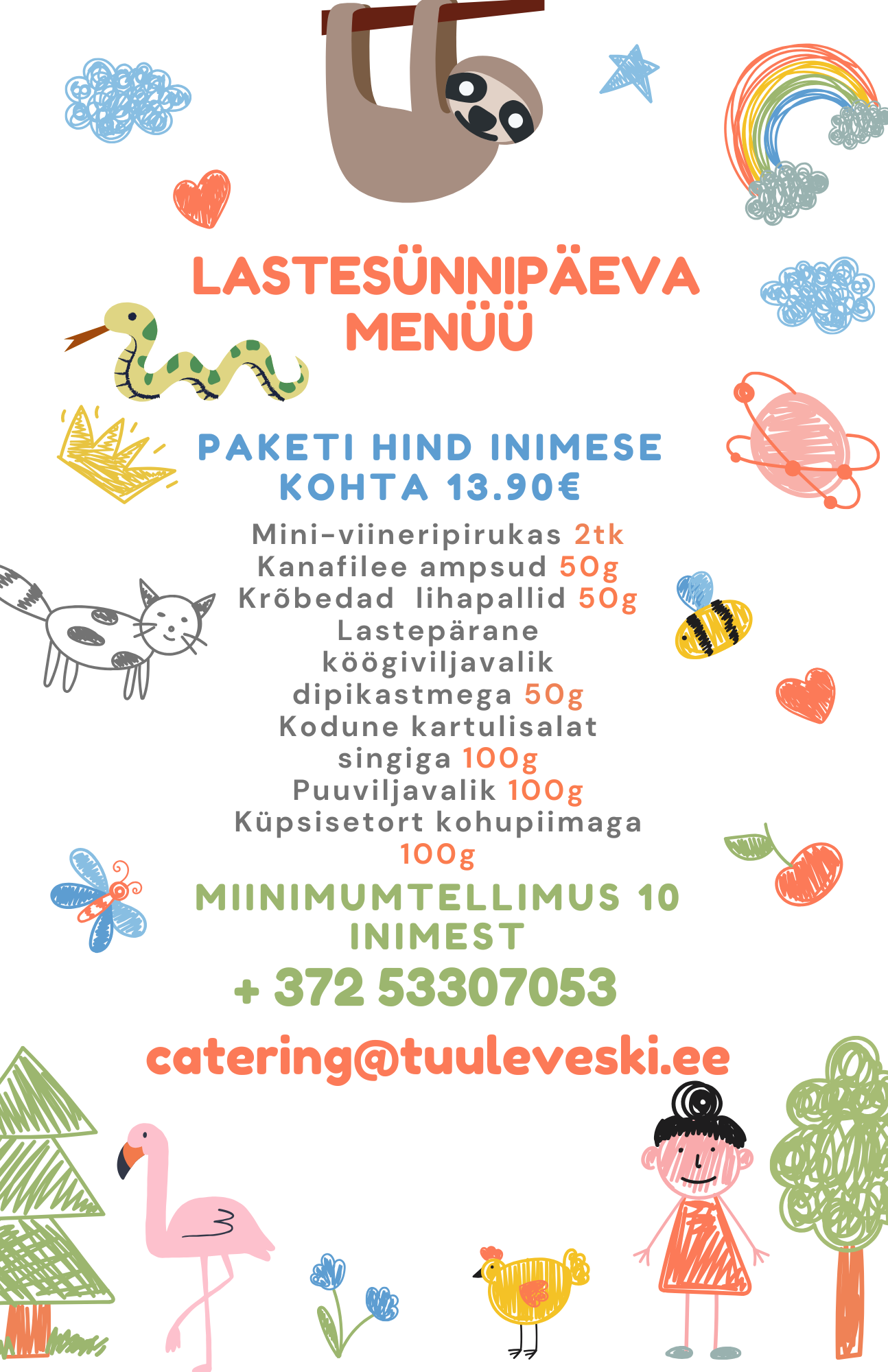 - Võimalus tellida peolaud vihmametsa restoranis või loodushariduskeskuses (min 10 last). Vaata menüüd siit. Tellimuse palume esitada catering@tuuleveski.ee, lisainfo tel 53307053.