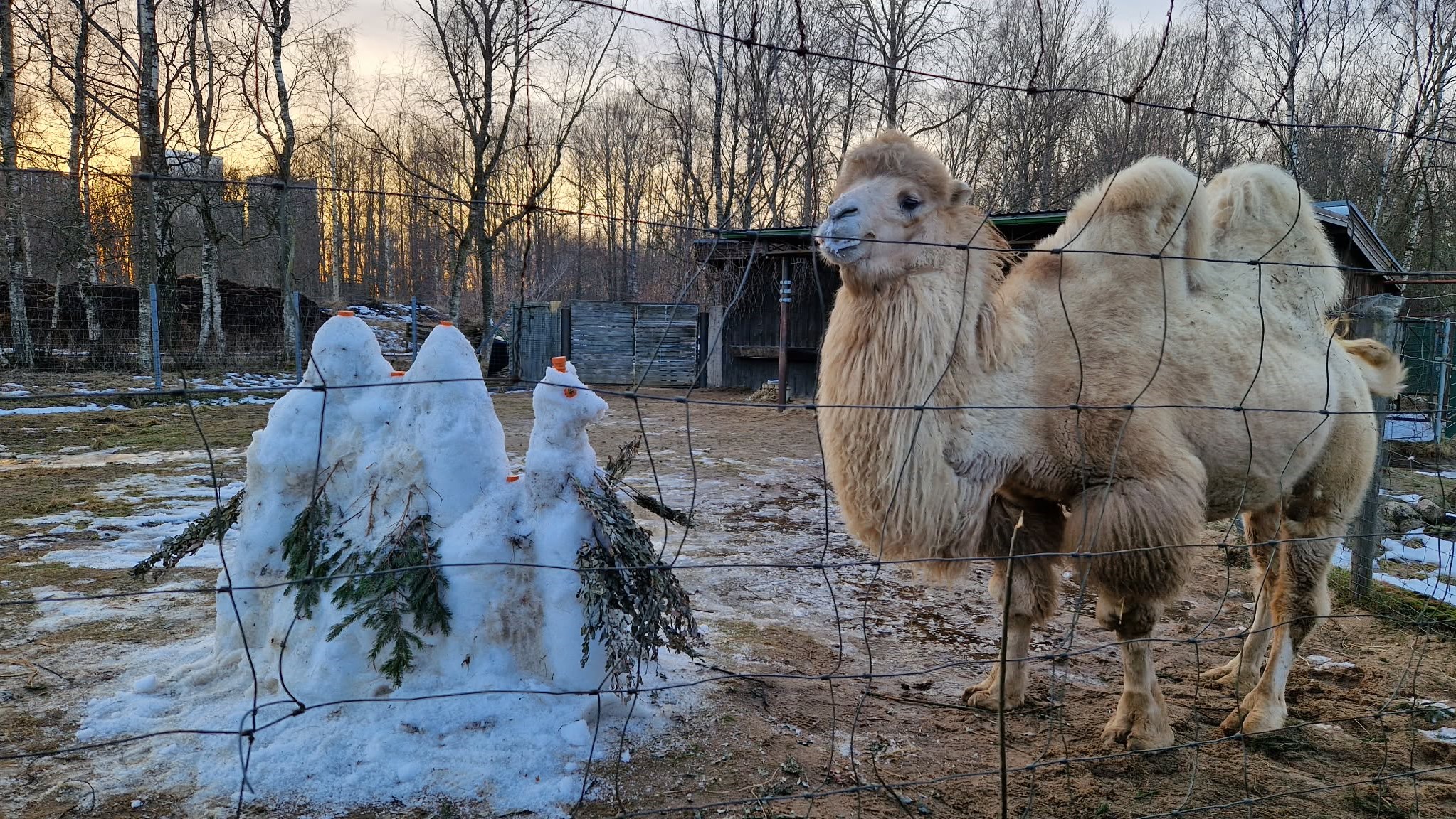 Neljapäeval aga meisterdasid lapsed lumest kaameli meie valge kaksküürkaameli Bulati õueaedikusse.